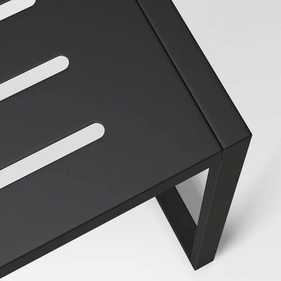 Create a beautiful outdoor dining setup with the Henning 4-Person Rectangle Patio Dining Table from Project 62™. Made with metal, this rectangular dining table features slatted design on top for an appealing look. It comes with an umbrella hole to help provide a little shade when needed. Boasting an all-weather design and rust resistance, this black dining table complements a variety of outdoor settings and accommodates up to four people. Simply add coordinating chairs to enjoy conversations with family or friends outdoors.